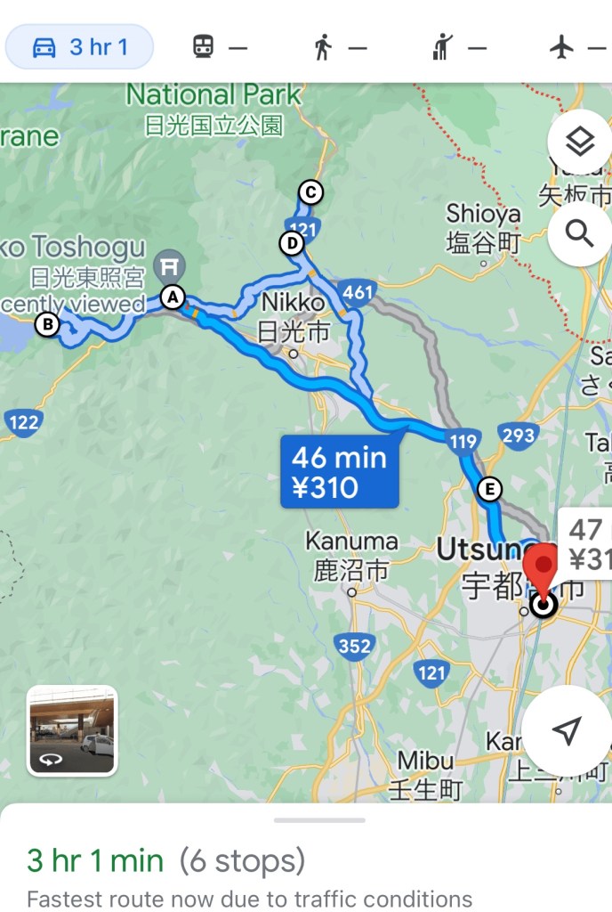 It takes only about 40 minutes to drive from Utsunomiya to Nikko, which means you will be there when the main shrine opens at 09:00, if you managed to get your car at 08:00. Note that while there is free parking at Nikko, it is most likely already taken even if you arrive when they open; there is paid parking, which is somewhat reasonable at 500 yen per vehicle; it is better to leave your car there and walk throughout Nikko.